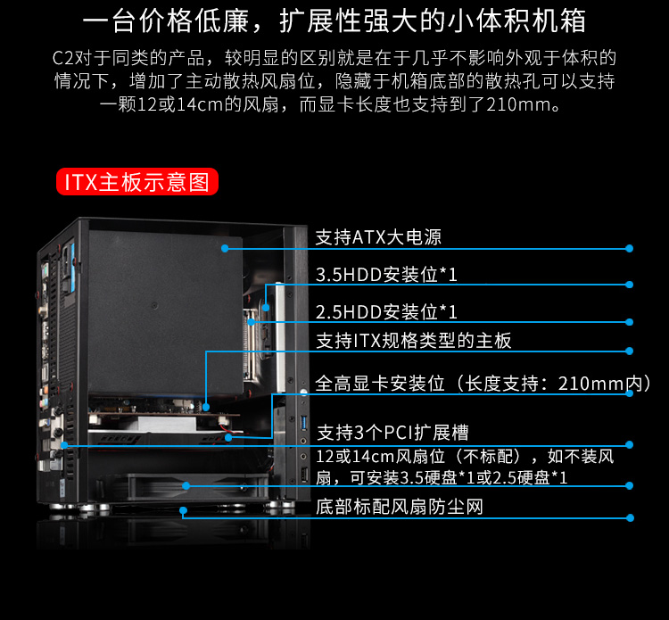 • 其它说明: 硬盘位支持:安装17*17CM主板:(硬盘位:2×3.5、 2×2.5 另底部加装1个12或14CM风扇后硬盘位为1×3.5、1×2.5),安装24.5*21.5CM主板(硬盘位为1×3.5或 1×2.5)